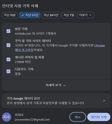 크롬: 브라우저 오른쪽 상단 점 세개 - 방문 기록 – 인터넷 사용 기록 삭제- 쿠키 및 기타 사이트 데이터 And 캐시된 이미지 및 파일 클릭후 – 데이터 삭제