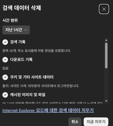 엣지: 브라우저 오른쪽 상단 점 세개 - 검색 데이터 삭제 - 쿠키 및 기타 사이트 데이터 And 캐시된 이미지 및 파일 클릭후 – 지금 지우기